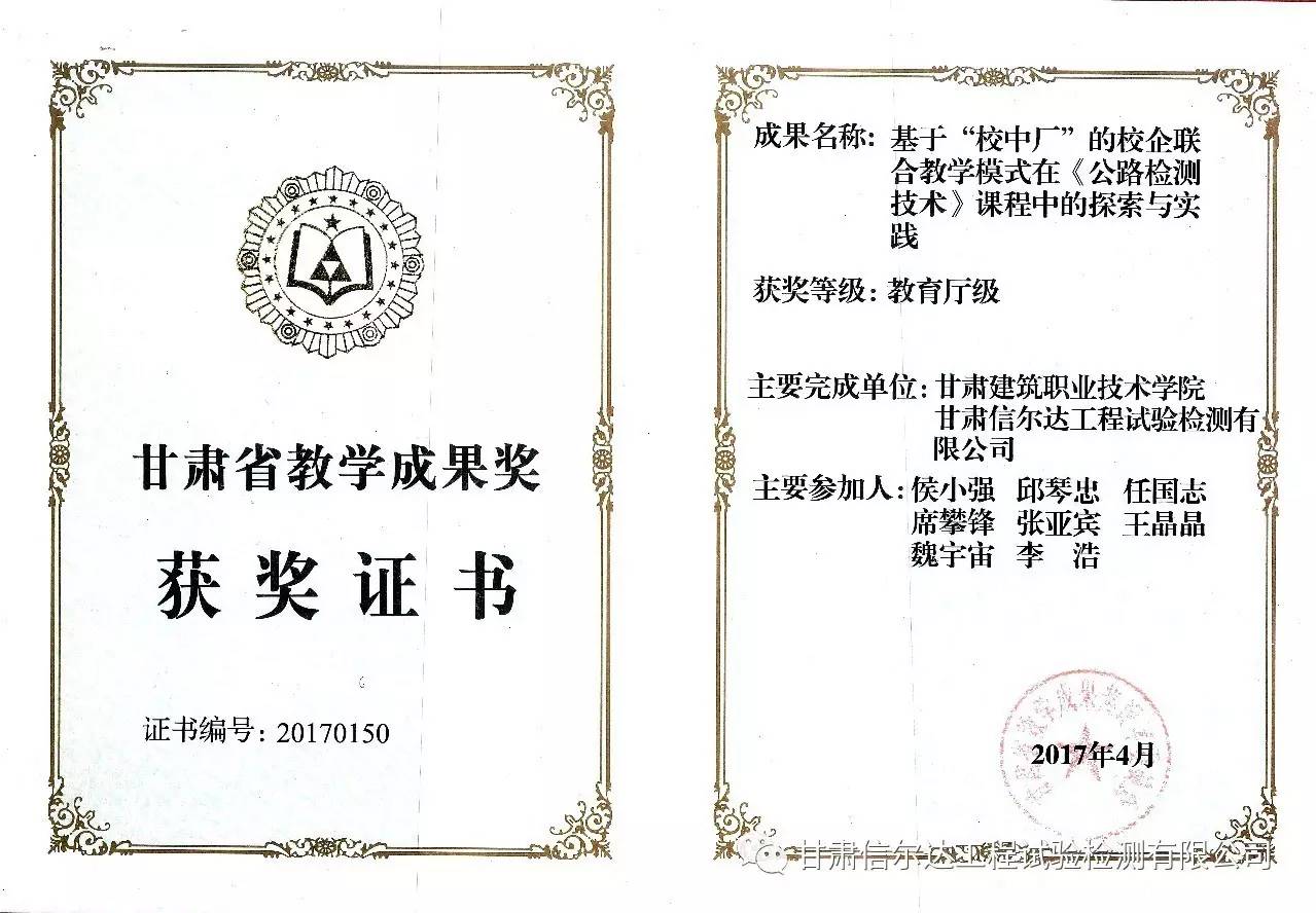 Xin'erda, a wholly owned Huabang subsidiary, was conferred Tertiary Education Didactics Prize by Education Dept of Gansu Provincial government. This is a fruit of 'cooperation of school and enterprise', more specific, is between Gansu Construction Vocational Polytech and Xin'erda Engineering. The didactics research is how to apply 'road test and inspection technology'.