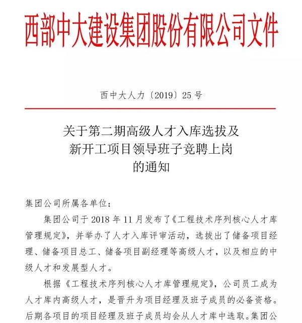 去年11月初,西部中大建设集团发布了《工程技术序列核心人才库管理规定》(以下简称规定),根据规定,公司员工成为人才库内高级人才,是晋升为项目经理及班子成员的必备资格;成为中级人才是晋升为从技术序列部长的必备资格;成为发展型人才是晋升为技术主管的必备资格。后期各项目的项目经理及班子成员、中层管理人员及核心技术骨干均会从人才库中选取。