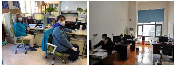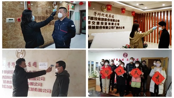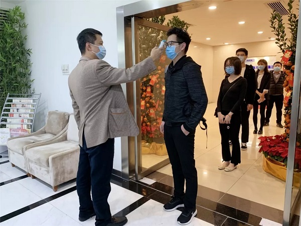 2月10日,是集团公司第二批次复工的日子。早上7时许,在广州管理总部,“疫情防疫”工作小组人员早早就在门前等候,等待第一批复工人员的到来。7点半不到,陆续有员工前来。大家戴着口罩,间隔1米左右排着队,等待测量体温,体温达标才能进入公司办公。在甘肃信尔达、喜易达等子公司,全体员工结束在家线上办公,戴上口罩、测量体温,有序的进驻消毒清洁后的办公室办公。