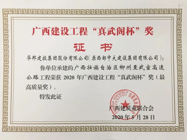 6月10日,广西传来喜讯,由华邦建投集团投资51亿元承建的广西柳州至武宣高速公路获得广西建设工程的最高质量奖——“真武阁杯”奖。