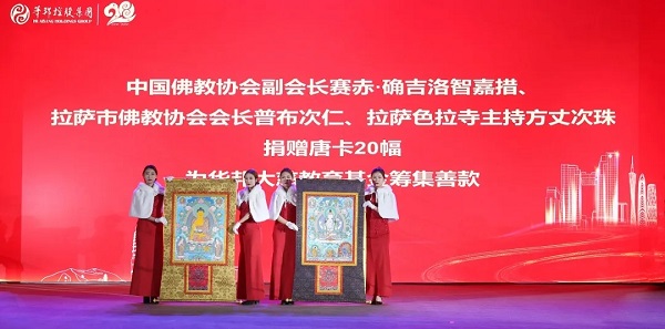 大慈之爱,永放光芒。中国佛教协会副会长赛赤·确吉洛智嘉措,拉萨市佛教协会会长普布次仁,拉萨色拉寺主持方丈次珠,现场捐赠20幅唐卡,为华邦大慈教育基金募集善款。