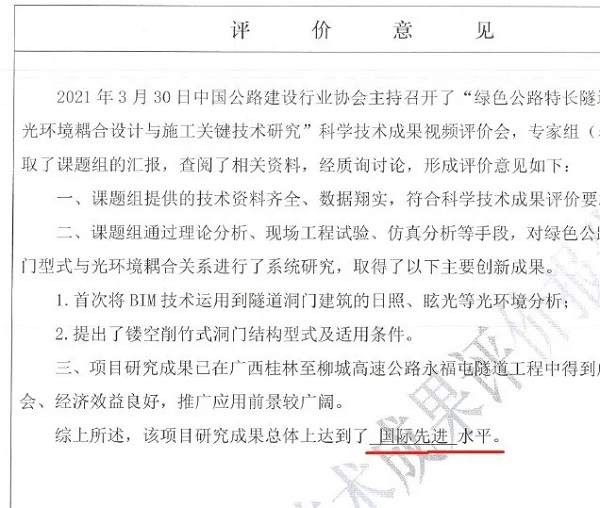 日前,在中国公路建设行业协会主持召开的科学技术成果视频评价会上,由华邦建投集团承担的“绿色公路特长隧道洞门型式与光环境耦合设计与施工关键技术”项目研究成果被鉴定达到国际先进水平。
