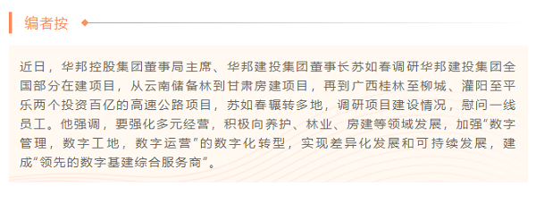 6月14日-15日,端午节期间,苏如春来到由华邦建投集团投资承建的广西桂林至柳城高速公路项目(概算总投资129亿元,BOT模式)、灌阳至平乐高速公路项目(概算总投资136.42亿元,PPP模式)调研,看望奋战在一线的华邦建投员工,并向端午节仍坚守岗位的一线员工表示慰问。他强调,要强化多元经营,积极向养护、林业、房建等领域发展,加强“数字管理,数字工地,数字运营”的数字化转型,实现差异化发展和可持续发展,建成“领先的数字基建综合服务商”。