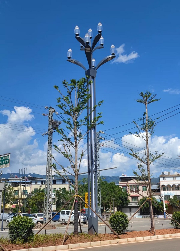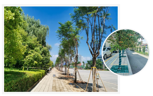 牟定县城绿化提升改造进行中,县城街道化湖北路道路两侧行道树栽植乔木蓝花楹,提升了整条道路景观性;行道树树池内采用绿色植草砖铺设,避免红土污染,又与周边硬质铺装和谐统一,同时保证了原有树木的日常养护不受影响。