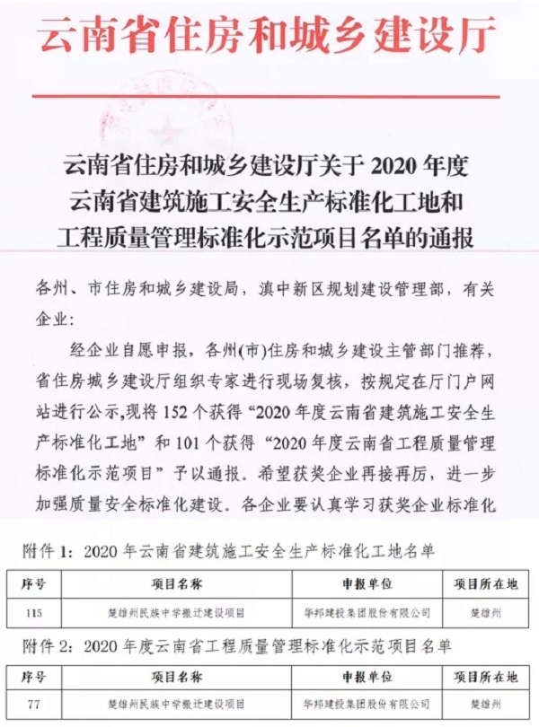 楚雄民中项目施工安全及工程质量获楚雄州及云南省相关单位认可