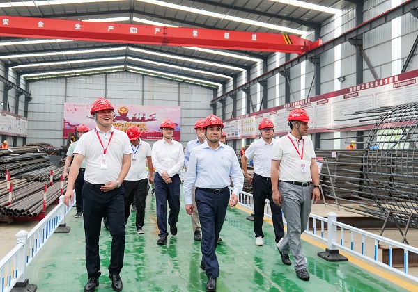 苏如春(前排中)调研灌平高速智能钢筋加工厂现场