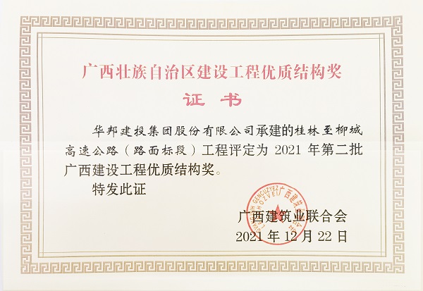 广西建设工程优质结构奖是广西建设工程主体结构施工质量的最高荣誉奖。评选工作在广西壮族自治区住房城乡建设厅的指导下由广西建筑业联合会组织实施。此次获奖,既是对桂柳高速路面工程建设成果的充分肯定,也是公司一直以来坚守建设品质工程初心的彰显。广西桂林至柳城高速公路全长96公里,总投资129亿元,是由广西交通投资集团和华邦建投集团携手奋斗1000多个日夜建成。该项目已于2021年12月3日建成通车。它的通车将大大缩短桂林-柳州两地之间的时空距离,桂林市到柳州市柳城县的高速公路行车时间由原来的2.5个小时缩短为1.5个小时,有力改善沿线交通条件,助力乡村振兴。