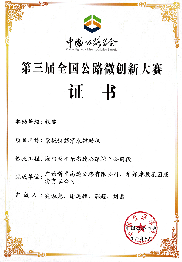 近日,在第三届全国公路微创新大赛表彰活动中,华邦建投集团与广西新平公司联合研发的《梁板钢筋穿束辅助机》技术荣获大赛银奖。此项荣誉的获得,不仅是对华邦建投灌平高速公路项目技术创新应用的肯定,也充分展现了华邦建投对创新引领发展理念的贯彻与落实。