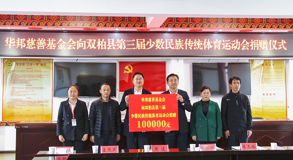11月23日,华邦慈善基金会向云南双柏县第三届少数民族传统体育运动会捐赠10万元,支持民族运动发展,助力国家级非遗项目“陀螺运动”文化传承。双柏县副县长李跃华,县民族宗教事务局局长李冬梅,县红十字会副会长王思卫;华邦建投集团双柏县“美丽县城”项目负责人周通等出席捐赠仪式。