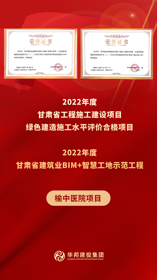 近日,在甘肃省建筑业联合会第五届会员代表大会第一次理事会暨总结表彰大会上传来喜讯,由华邦建投集团承建的甘肃傅苦公路项目、永昌一中项目、银西市政项目、玉门东镇公路项目、玉门风渡厂房项目荣获2022年度“甘肃省建设工程文明工地”称号;榆中医院项目荣获2022年度甘肃省工程施工建设项目绿色建造施工水平评价合格项目、甘肃省建筑业BIM+智慧工地示范工程,为公司赢得了良好声誉。