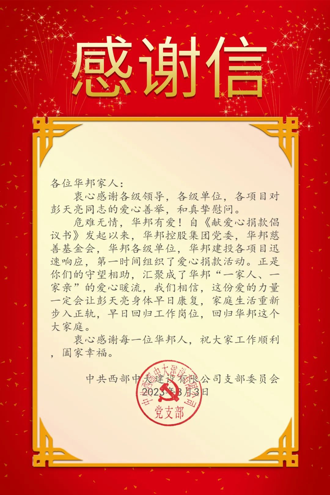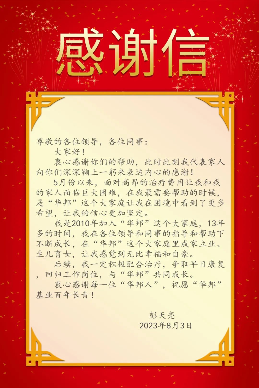 这笔善款不仅解决了彭天亮一家燃眉之急,更饱含了华邦人团结一心、守望相助的深厚情谊,也是对他早日康复、幸福平安的祈愿。彭天亮在感谢信中写道:“在华邦这个大家庭里成家立业、生儿育女,让我感觉到无比幸福和自豪,我一定积极配合治疗,争取早日康复,与华邦共同成长。”