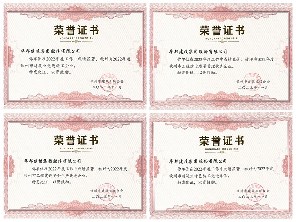 11月5日,经广西钦州市建筑业联合会评审,华邦建投集团荣获2022年度“钦州市建筑业先进施工企业”“钦州市工程建设质量管理优秀企业”“钦州市工程建设安全生产先进企业”“钦州市建筑业绿色施工先进单位”四项荣誉,华邦建投集团总经理杨川荣获“钦州市建筑业优秀企业经理”称号,赵加强、姚军分别荣获“钦州市建筑业先进工作者”“钦州市建筑业优秀项目经理(建造师)”称号。本次获评是对华邦建投集团建设能力、规范管理等综合实力的肯定。