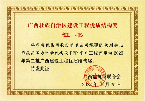 广西建设工程优质结构奖是由广西建筑业联合会组织严格评选出的工程主体结构施工质量的最高荣誉奖,项目获此奖项表明钦州幼专项目的结构工程质量达到广西领先水平。