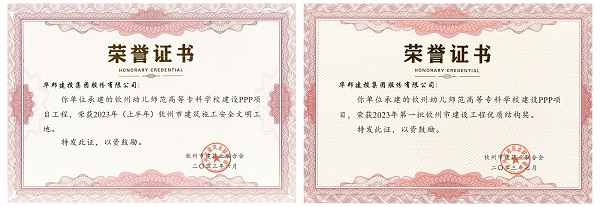 在项目建设期间,华邦建投集团高度重视安全文明施工和施工质量精细化管理,大力应用新技术、新工艺、新设备,不断提升工程安全质量水平。基于优秀的施工质量和精工品质,华邦建投集团钦州幼专项目先后荣获“钦州市建筑施工安全文明工地”称号、2023年第一批“钦州市建设工程优质结构奖”等奖项。