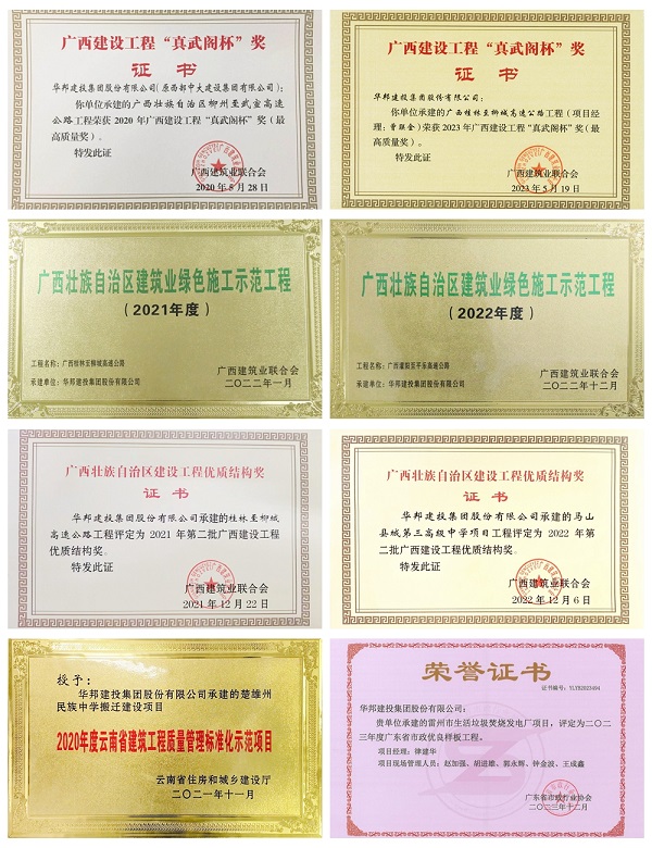 一直以来,华邦建投集团以“施工精细、技术精妙、管理精心、工艺精湛、精益求精”为目标,致力于创建品质工程。多个项目获省市级表彰,其中,广西柳州至武宣高速公路、桂林至柳城高速公路均获广西建设工程“真武阁杯”奖(广西工程质量最高奖)、广西桂林至柳城高速公路及广西灌阳至平乐高速公路获广西建筑业绿色施工示范工程、广西马山县城第三高级中学项目获广西建设工程优质结构奖、甘肃榆中教育园区和榆中医院项目获“甘肃省建设工程文明工地”称号、云南楚雄民族中学搬迁建设项目获云南省建筑工程质量管理标准化示范项目、广东雷州电厂项目获广东省市政优良样板工程……