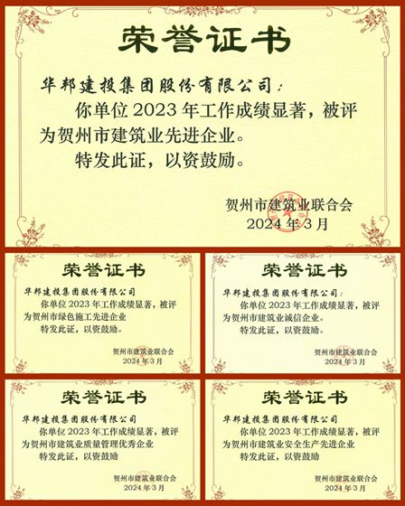 春风有信传佳讯,细雨随心润草泥。近日,经广西贺州市建筑业联合会评审,华邦建投集团荣获2023年度“贺州市建筑业先进企业”“贺州市建筑业诚信企业”等五项荣誉,贺州“三馆一中心”项目负责人谈章荣获“贺州市建筑业优秀建造师”称号。本次获评是对华邦建投集团建设能力、规范管理等综合实力的肯定。