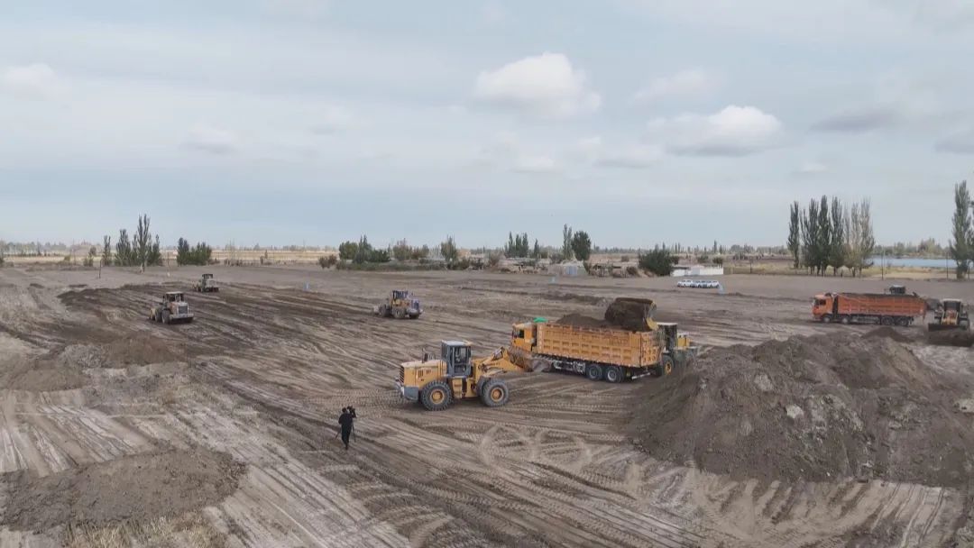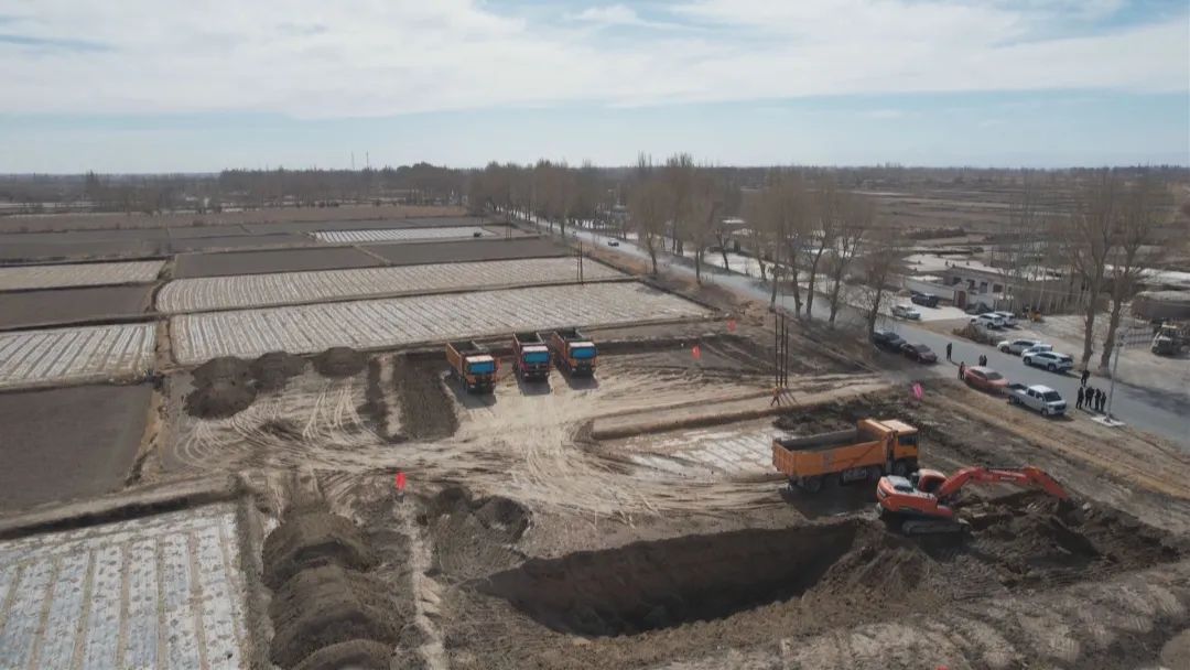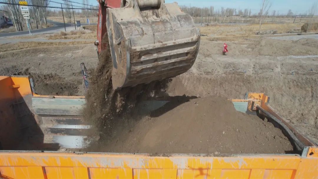 高标准农田一头连着粮食安全,一头连着农民增收,在玉门市柳河镇二道沟村2024年高标准农田建设现场,挖掘机和大型卡车已经进场,正在对沉砂池进行土方开挖工作。