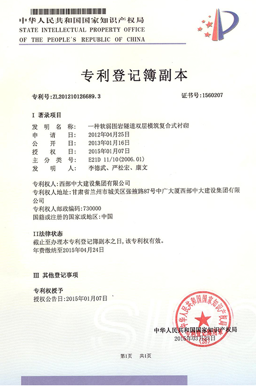 西部中大建设集团有限公司公司结合兰州市北环路(安宁至109国道段)工程九州隧道软弱破碎围岩的特性,经过几年的研发,在隧道衬砌施工技术工艺上有了突破, 获得一种软弱围岩隧道双层模筑复合式衬砌的发明专利。经国家知识产权局2015年1月7日授权公告,2015年3月23日正式批准并发放发明专利证书。这是西部中大建设集团近年来技术研发上取得了又一重要成果,专利号为ZL201210126689.3。