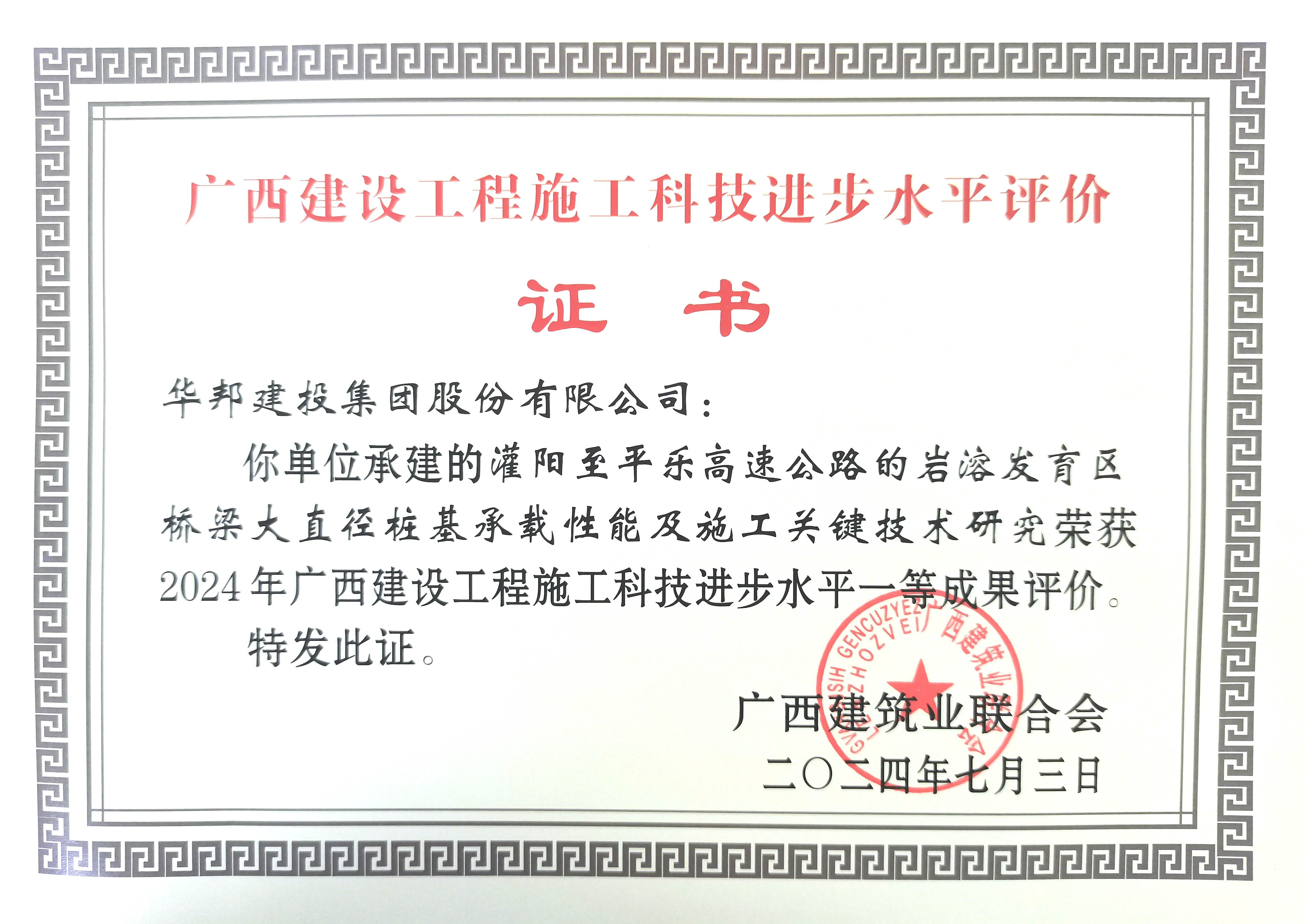 肩鸿任钜踏歌行,功不唐捐玉汝成。在广西,依托桂林至柳城高速公路、灌阳至平乐高速公路建设,由华邦建投集团主导研究的《岩溶峰丛区特长公路隧道绿色建造关键技术》《岩溶发育区桥梁大直径桩基承载性能及施工关键技术研究》2项课题获得2024年广西建设工程施工科技水平一等成果评价。
