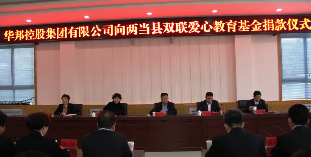 2016年4月1日,华邦控股集团向两当县双联爱心教育基金捐款500万元,用于资助贫困学生,推动当地教育事业发展。这是华邦集团在参与甘肃光彩事业,推进双联行动,承担社会责任的又一义举。