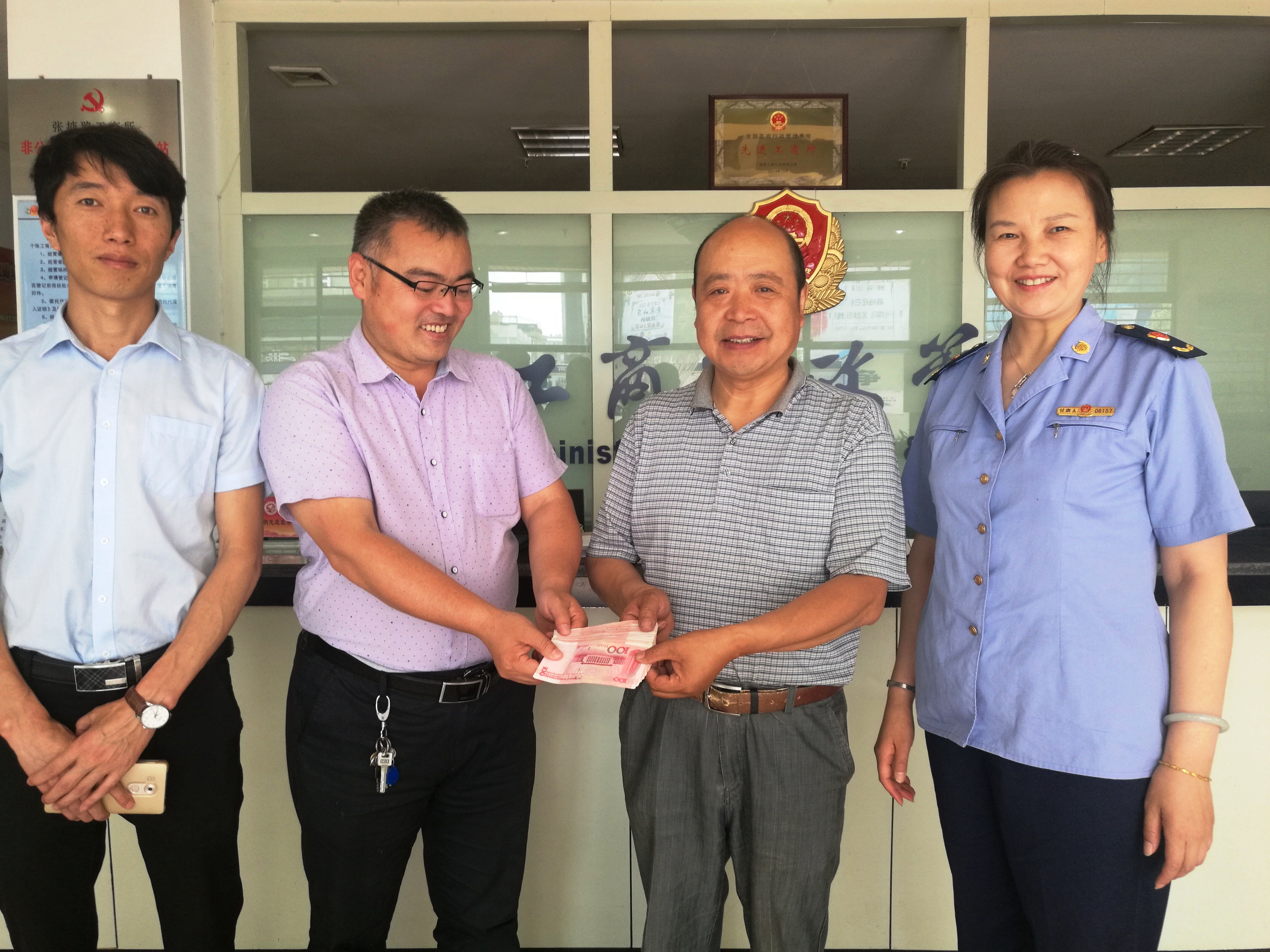白先生向张掖路工商所副所长张静(左一)及捐助单位代表汇报受助学生学习情况