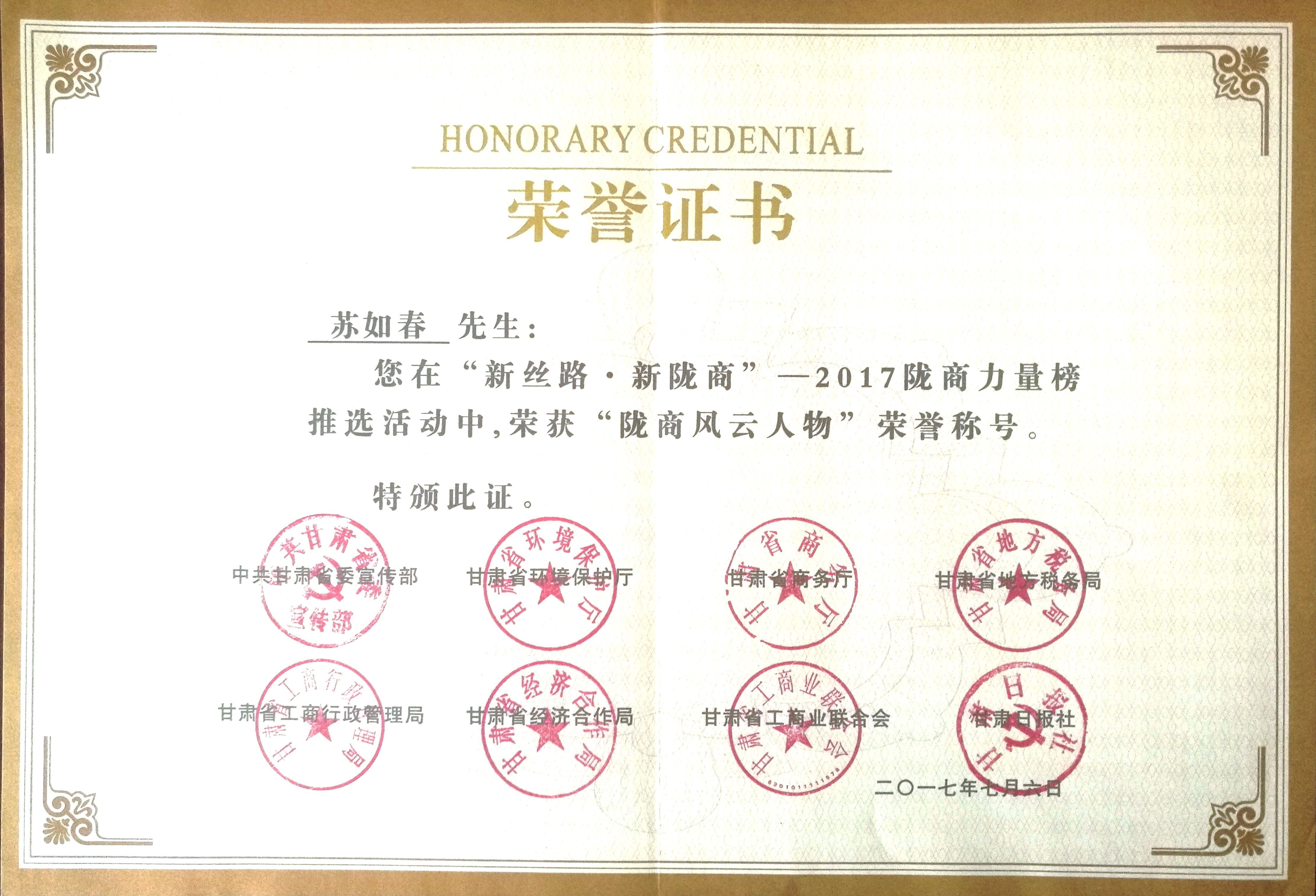 论坛上宣读了“新丝路·新陇商”——2017陇商力量榜“陇商风云人物”。西部中大建设集团股份有限公司董事长苏如春凭借其个人及带领的企业近年来在“建设甘肃、发展甘肃、回报甘肃”以及为甘肃经济发展做出的杰出贡献和出色表现,受到甘肃省各级政府的高度肯定和认同,通过参与各方严格按照推选办法遴选推荐,苏如春董事长荣获了该荣誉称号。