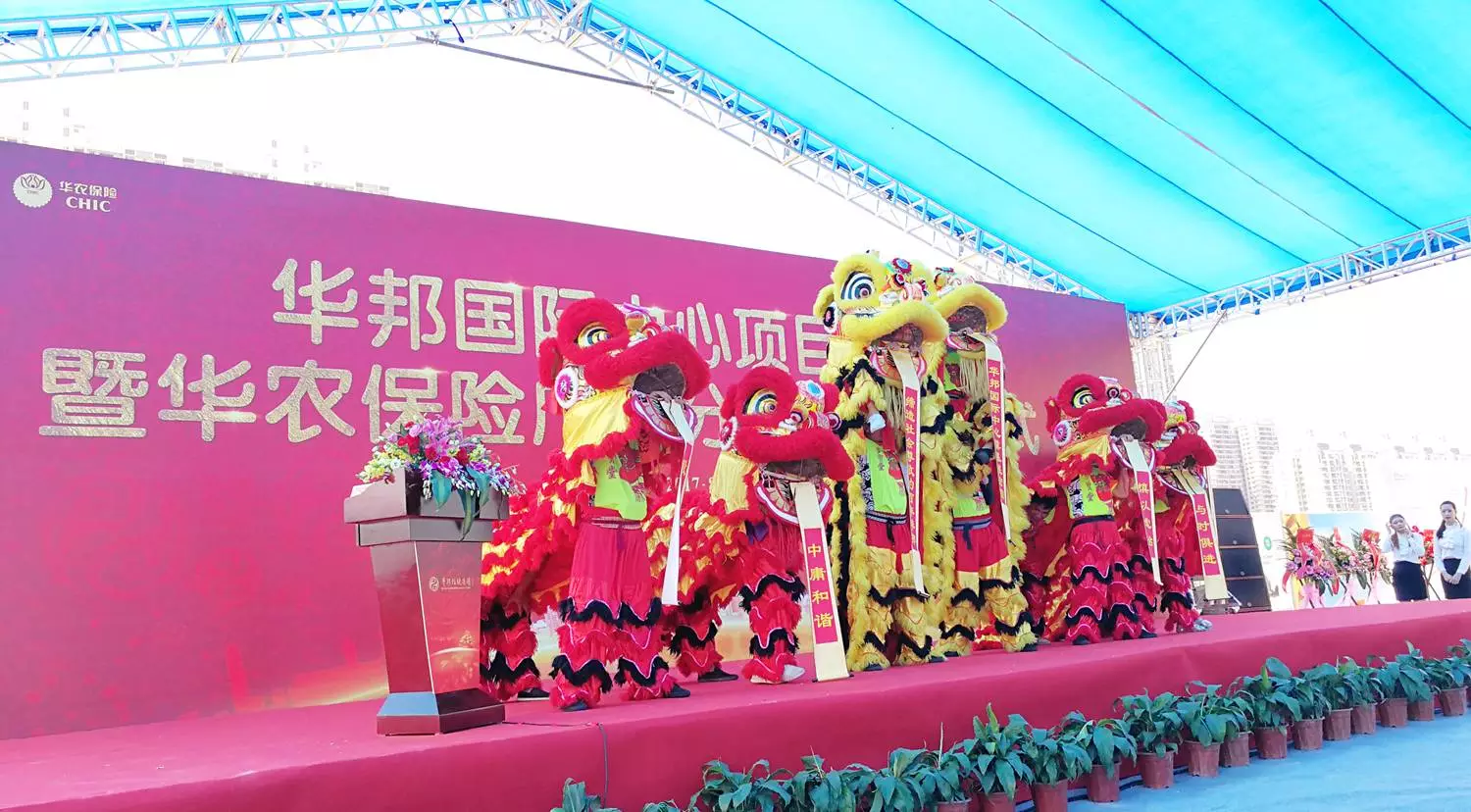 晴空万里,珠水欢腾,舞狮点睛,共襄盛举。盛大的喜庆典礼,华邦控股集团董事、幸福家园集团有限公司总裁李顺臣介绍华邦国际中心规划建设情况,华农财产保险股份有限公司总经理张宗韬发言,全国政协委员、华邦控股集团董事局主席、西部中大建设集团股份有限公司董事长、华农财产保险公司董事长苏如春致辞。广东省人民政府驻北京办事处、驻西安办事处,甘肃省广东商会等全国各地28家广东商会,甘肃省北京商会、甘肃省浙江商会等纷纷发来贺电并送上祝福花篮。各级领导、社会各界、特邀嘉宾、新闻媒体,华邦控股集团总部及各子公司中高层管理者、员工代表300多人出席了仪式。